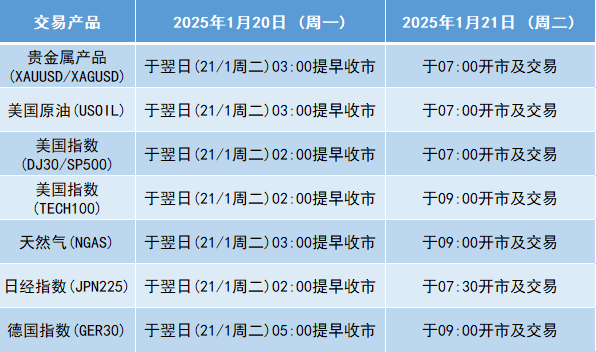 因应美国马丁路德金纪念日假期2025年1月20日(周一), 本公司以下产品的交易时间将于假期期间作以下安排,敬请留意。