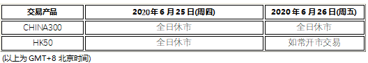 因应2020年625日(周四)为中国大陆和香港端午节假期,沪深300指数CHINA300和恒生指数HK50将于假期期间休市,敬请阁下留意知悉: